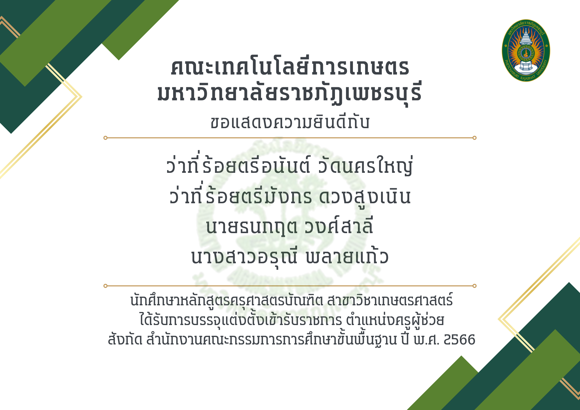 4 ก.ค. 2566 นักศึกษาหลักสูตรครุศาสตรบัณฑิต สาขาวิชาเกษตรศาสตร์ ได้รับการบรรจุแต่งตั้งเข้ารับราชการ ตำแหน่งครูผู้ช่วย สังกัด สำนักงานคณะกรรมการการศึกษาขั้นพื้นฐาน ปี พ.ศ. 2566