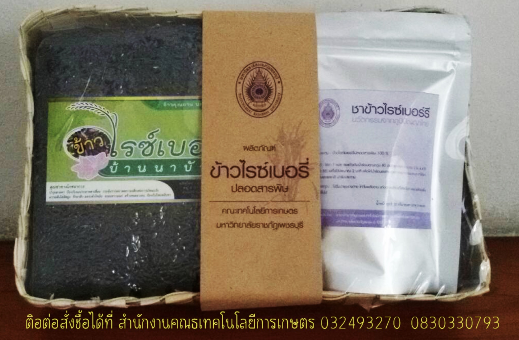 ชุดผลิตภัณฑ์ข้าวไรซ์เบอร์รี่ ประกอบได้ด้วย ข้าวไรซ์เบอร์รี่ 1 กิโลกรัม และ ชาข้าวไรซ์เบอร์รี่ 2 ซอง บรรจุในตะกร้าใบตาล