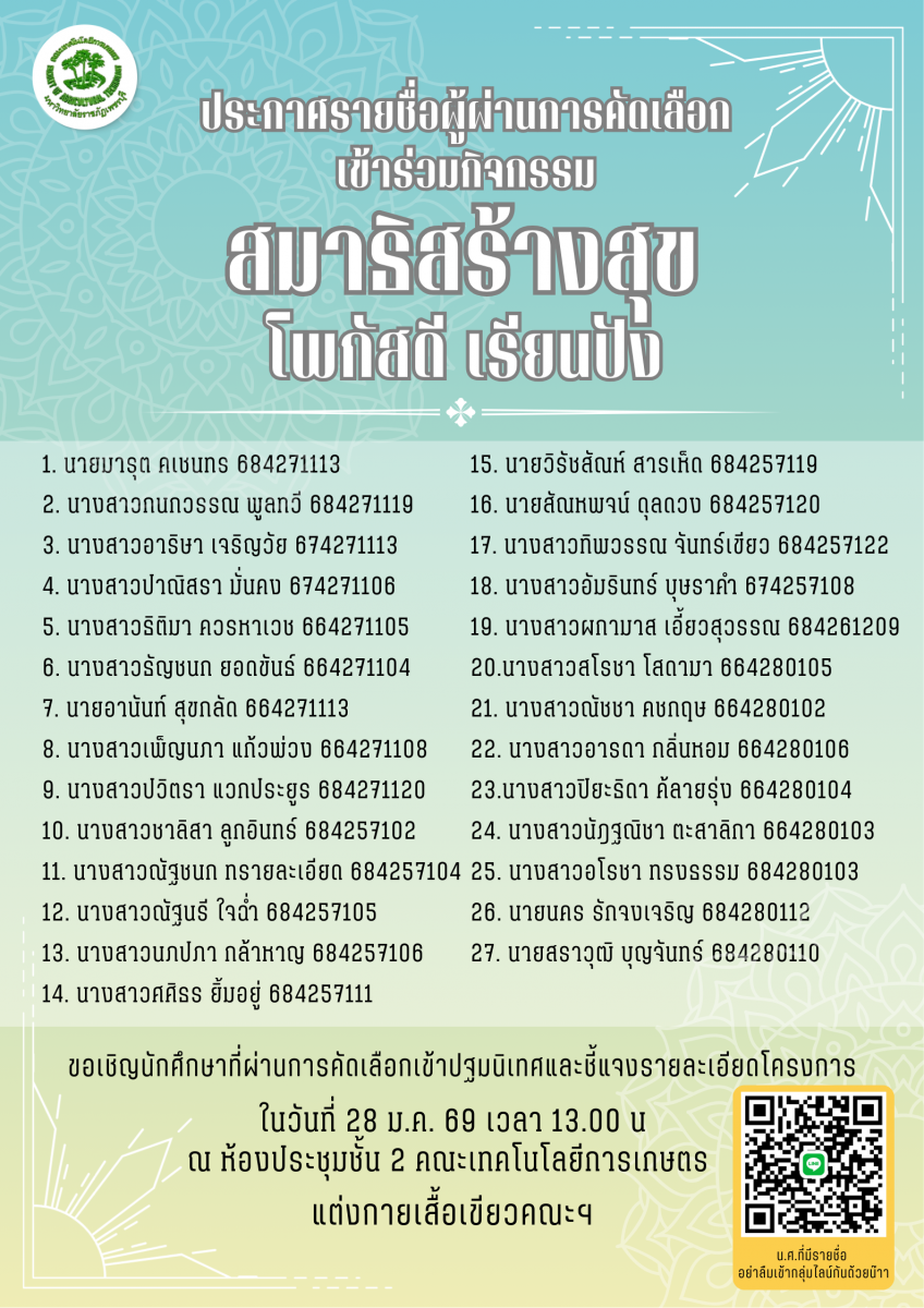 สามารถตรวจสอบรายชื่อผู้ผ่านการคัดเลือกได้จากภาพประกาศนี้ขอเชิญผู้ผ่านการคัดเลือกเข้าร่วมปฐมนิเทศและชี้แจงรายละเอียดโครงการ